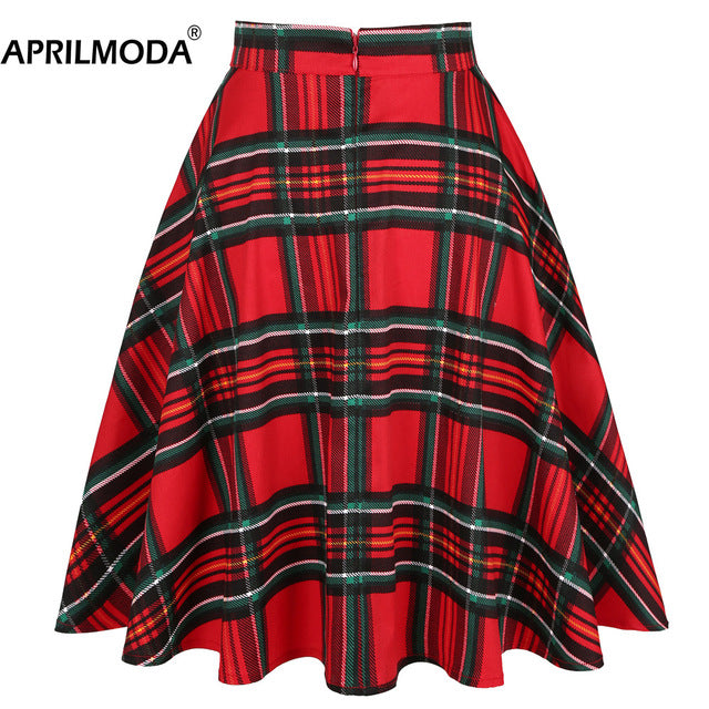 Red Women Pleated Skirt High Waist Checkered Plaid